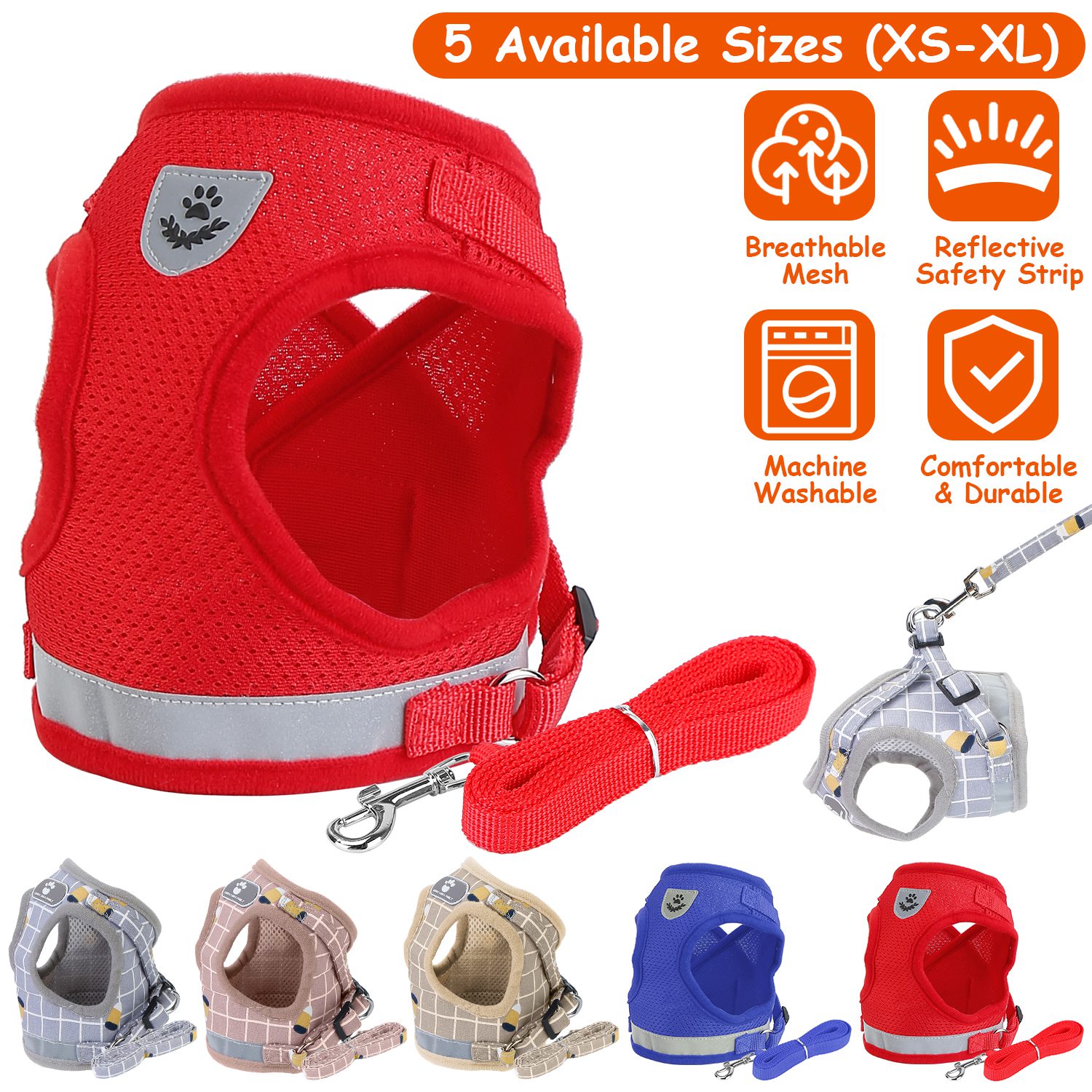 Made of 100% polyester with soft edges and breathable mesh padding, come with adjustable harness and paste strip, our pet chest strap can provide extra comfort and protection. A long reflective strap makes your dog more visible and safe in dark, great for going out at night. 360° Rotatable clasp and 3.94ft leash allow your dog to play outside with freedom. Five sizes and colors are provided for more choices.