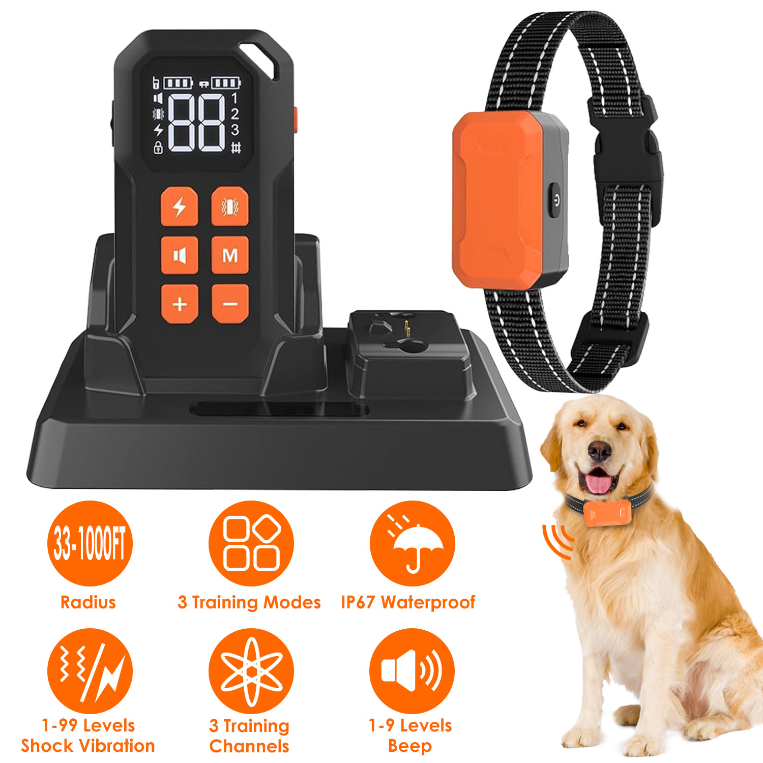 Our training system combines wireless fence and dog training into one. It has 3 extremely efficient and safe training modes (beep, vibration and shock modes) for you to teach a dog basic obedience commands and correct your dog’s inappropriate behaviors. This training collar receiver has IP67 waterproof, freely use in outdoor activities. Moreover, it has longest remote radius (up to 1000ft), which helps you to freely train your dog at backyard, park, beach, etc.. It's amazing that you can take your dogs go out and no troubles anymore, your beloved dogs will be nice and well-behaved, you can really enjoy playing with them.